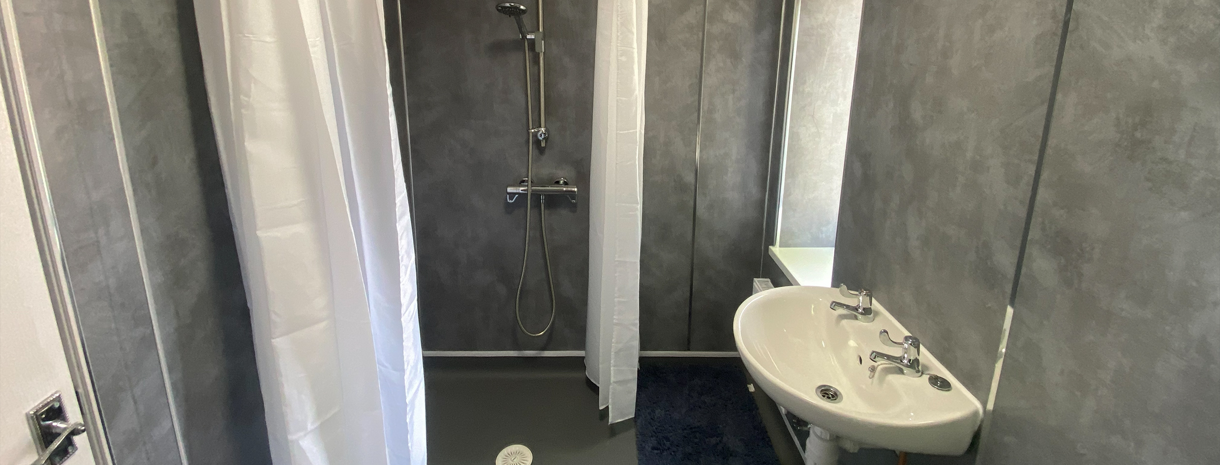 The floor slopes gently towards a drain. This allows water to flow away easily and prevents pooling. As a result, the whole room can be used as a showering space, giving you more freedom to move around.